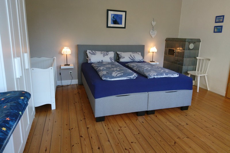 Im Elternschlafzimmer mit Boxspringbetten befindet sich ein Babybett und die Wickelkommode. Im zweiten Schlafzimmer gibt es zwei Einzelbetten.